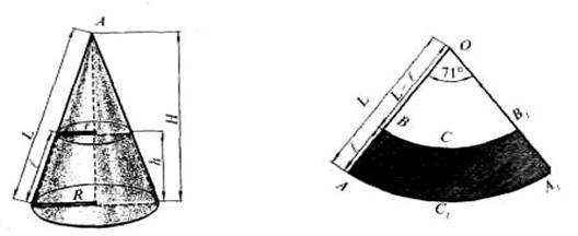 !Достраиваем усеченный конус до полного (зная угол при основании конуса это не сложно).Высчитываем высоту поверхности полного конуса (сумма квадратов катетов равна квадрату гипотенузы). Полученная величина - радиус окружности, сектор которой нам нужен. На этой окружности необходимо отложить длинну, равную длинне окружности основания исходного конуса (2Пr). В бытовых условиях это можно сделать без расчетов - гибким сантиметром  Но вот умные люди посчитали, что сектор получится 71 градус!