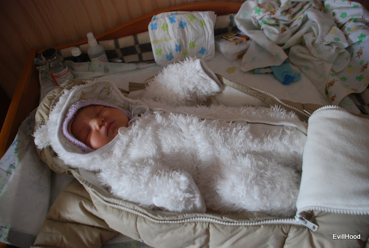 Фактически выглядело так: слип, чепчик хб. След. слой - мишка без утепления как утолщитель и заполнитель "ниш"))), далее комбез на утеплителе непродуваемый + шерстяная шапка.