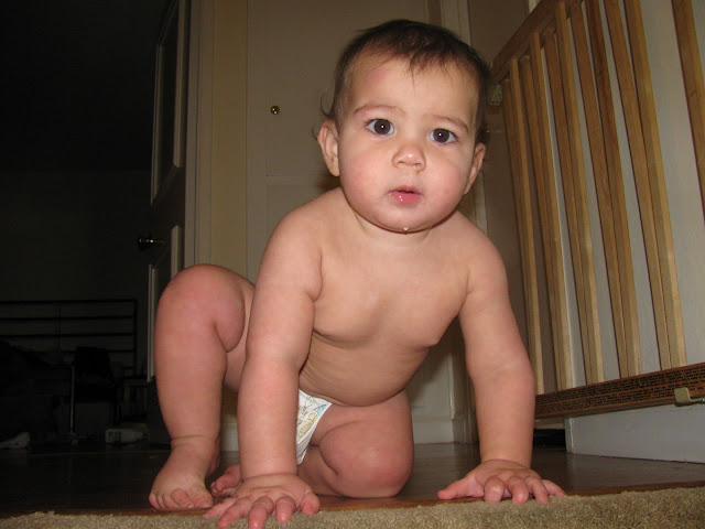 мы ползали в штанишках-трусиках-колготках + футба-кофточка. Памперс только на сон и прогулки. Обувь с 9 мес на 10 мин, постоять. А как пошла, обувь на прогулке, дома - босиком.