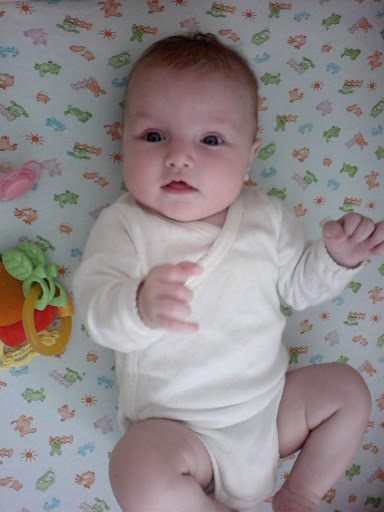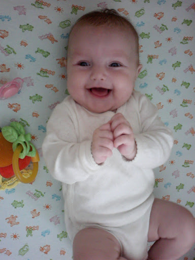 Смотрю, у вас рядом прорезыватель лежит - уже грызет? Я старшей такой купила месяцев в 5, наверное.